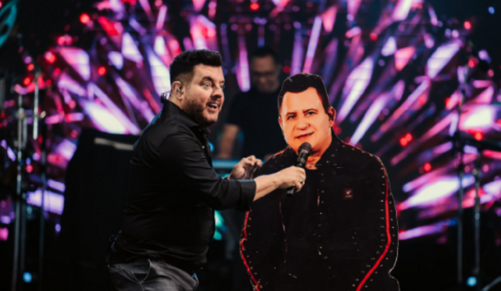 O cantor Bruno, da dupla Bruno e Marrone, está se apresentando sozinho desde o anúncio de que Marrone se afastaria dos palcos para cuidar da saúde. Neste último sábado (22), durante show na Festa de São João de Serrinha, na Bahia, o sertanejo encontrou uma solução criativa para acompanhá-lo no palco: um totem de papelão que simula o companheiro de dupla. Enquanto cantava Vidro Fumê, um integrante da produção entrou no palco carregando o totem, que mostrava um Marrone devidamente sentado em seu banquinho. Sem perder o humor, Bruno abraçou o totem e até fez um sinal de “chifre” com os dedos. “Você não pôde estar presente, mas demos um jeito de você estar no show. Saudades de você, companheiro”, disse Bruno na legenda de um post no Instagram. Marrone anunciou, na semana passada, que se afastaria dos palcos para fazer uma cirurgia para tratar caso de glaucoma severo. Enquanto isso, Bruno segue cumprindo a agenda da dupla.