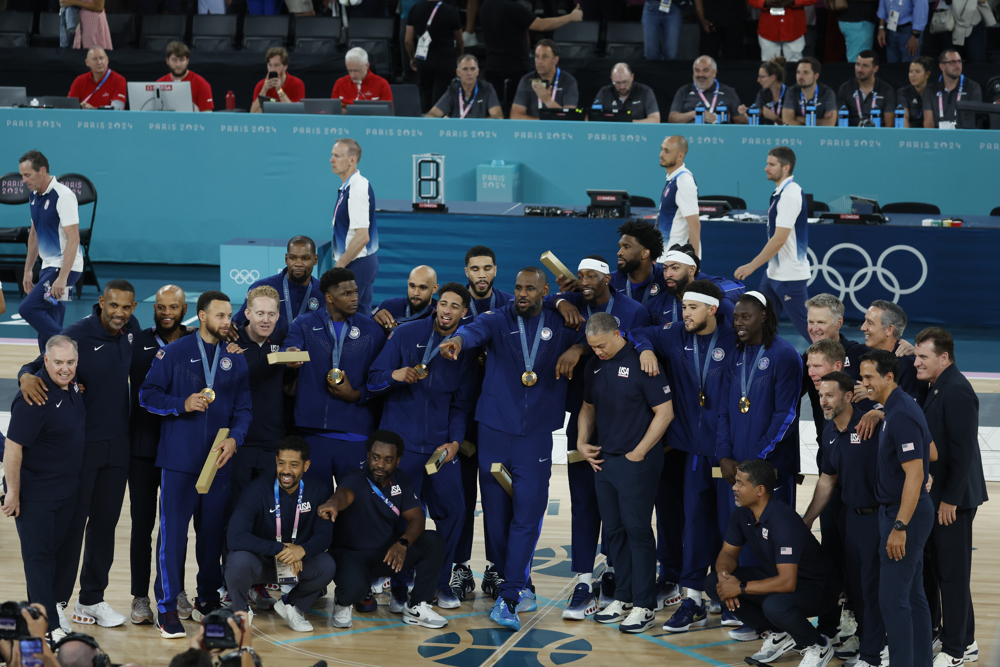 A equipe dos Estados Unidos comemora a medalha de ouro no basquete masculino