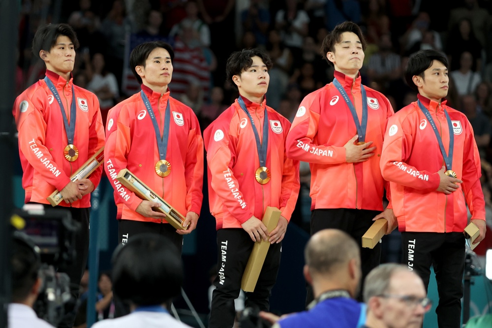 EFE/EPA/YAHYA ARHABParis (France), 29/07/2024.- Gold medalist Team Japan listen to their national anthem during the medal ceremony for the Men Team final of the Artistic Gymnastics competitions in the Paris 2024 Olympic Games, at the Bercy Arena in Paris, France, 29 July 2024. (Francia, Japón) EFE/EPA/YAHYA ARHAB