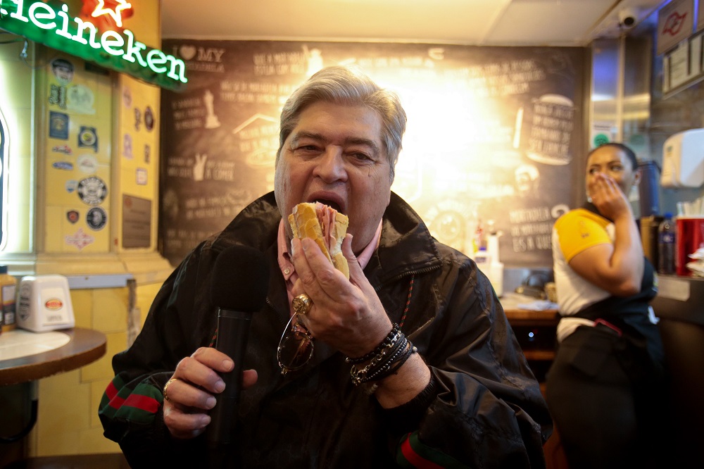 José Luiz Datena come sanduíche de mortadela durante visita ao Mercadão