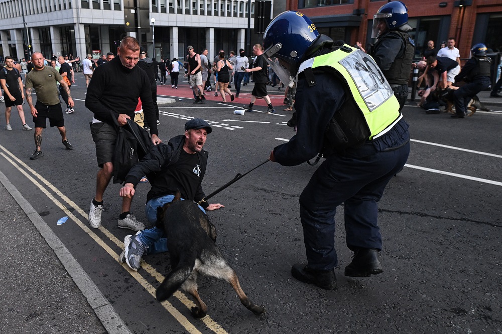 JUSTIN TALLIS/AFP Um cão policial morde um manifestante em Bristol, no sul da Inglaterra