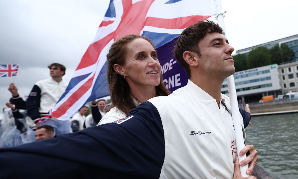 Saltador de trampolim Tom Daley e a remadora Helen Glover deram um toque de simpatia no evento e foram ovacionados pelo público Reprodução/X/@olympics saltador de trampolim...