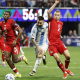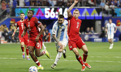 Moise Bombito foi atacado nas redes sociais por torcedores da seleção argentina; federação canadense se mostrou ‘profundamente incomodada’ EFE/EPA/ERIK S. LESSER Moise Bombito e Messi durante...