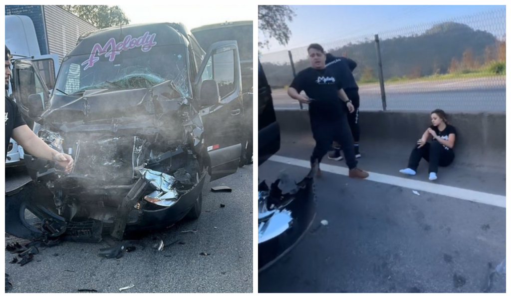 A van que transportava a cantora Melody sofreu um acidente na tarde deste sábado (20), na Via Dutra, em Barra Mansa, no Rio de Janeiro. O veículo se envolveu em um engavetamento, durante o deslocamento para um show. A van recebeu na traseira o impacto de ônibus de viagem e avançou, batendo no carro da frente. Os carros, inclusive a van da artista, com o staff a bordo, ficaram bastante danificados. Melody assegurou seus seguidores, por vídeos nas redes sociais, que todos os envolvidos estão bem. “Gracas a Deus ninguém morreu. Está todo mundo bem”, afirmou. A Polícia Rodoviária Federal reportou que pelo menos dez veículos participaram do acidente.